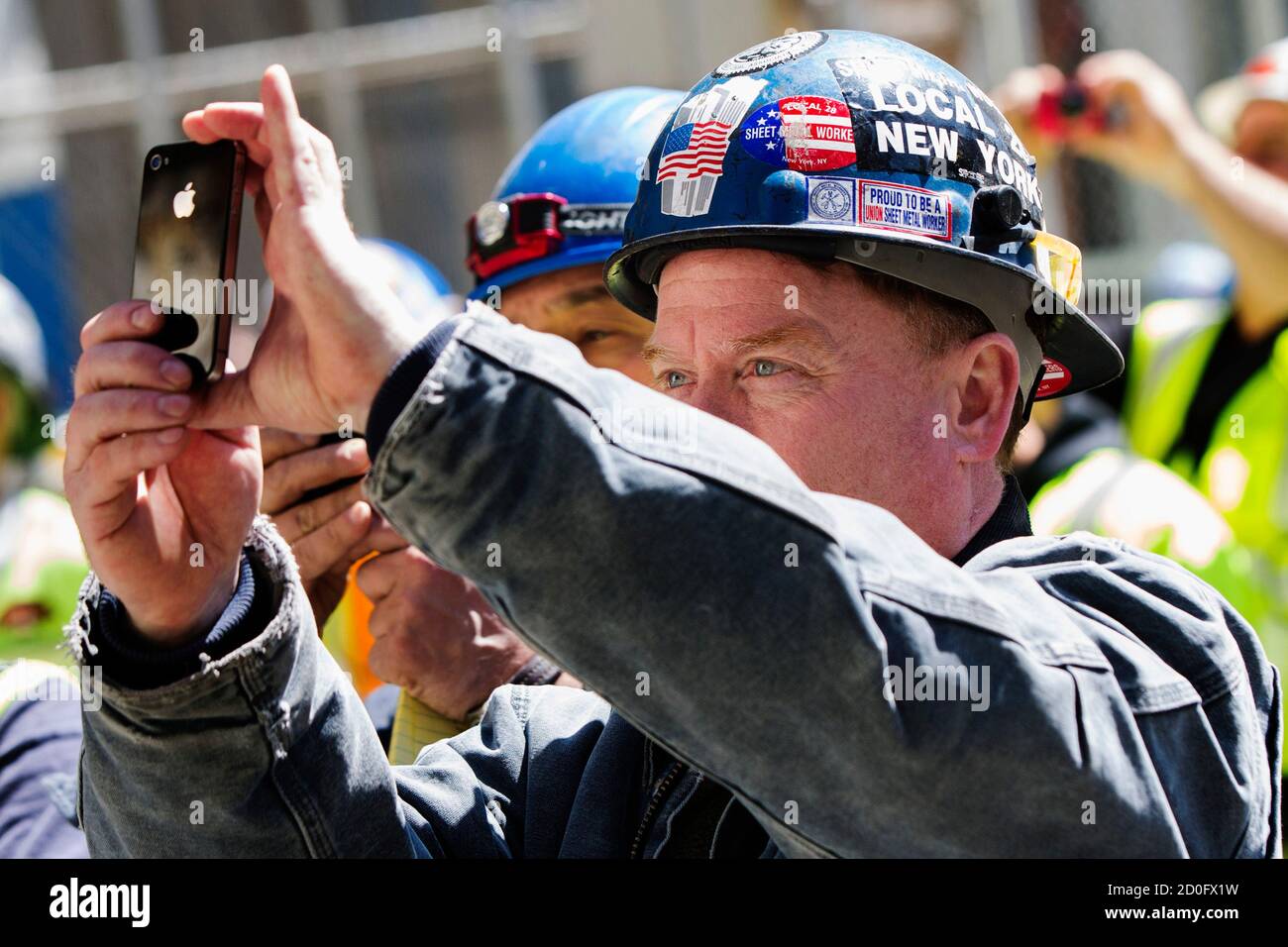 Ground Zero Workers Photograph With Their Phones As The Final Piece Of One World Trade Center S Spire Is Lifted To The Top Of The Building In New York May 2 2013 Crane